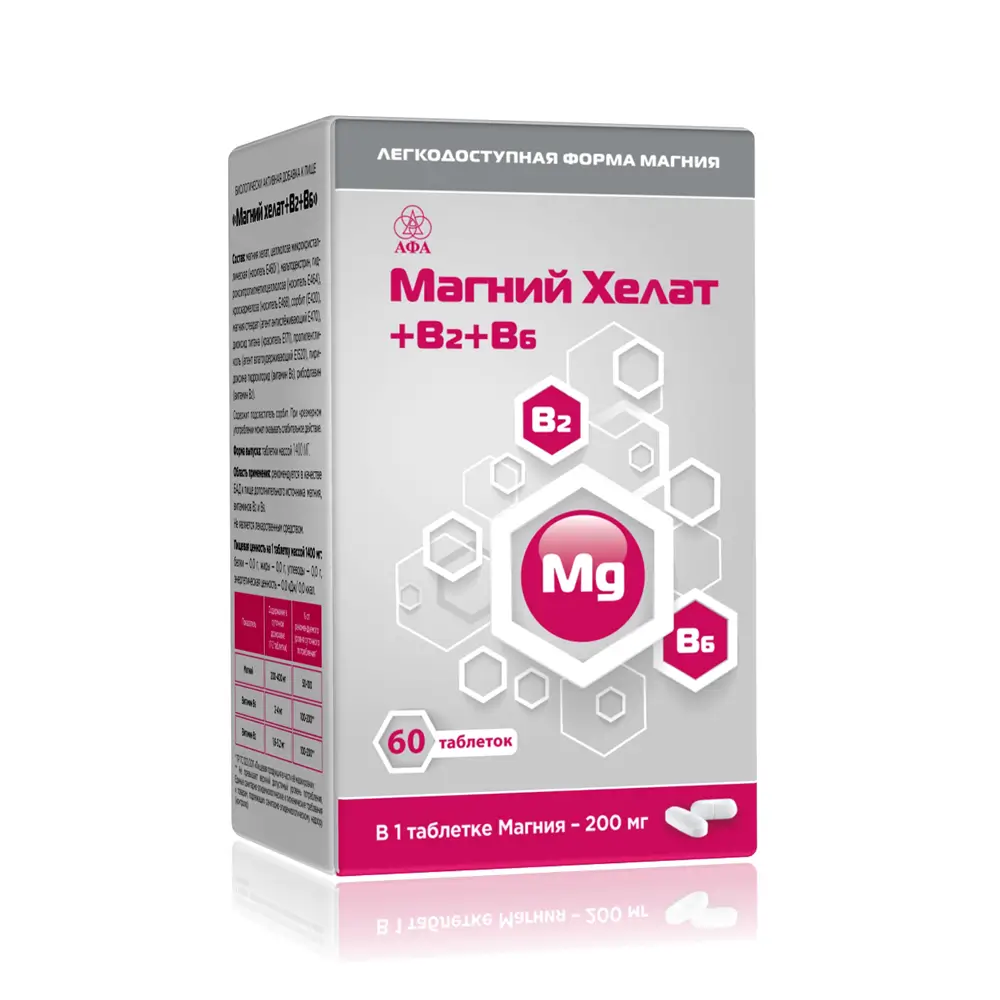 Биодоступный магний из аминокислотного хелатного комплекса, обеспечивающего максимальное усвоение магния. Усиленная формула витамином В2 и В6 для профилактики последствий хронического стресса.