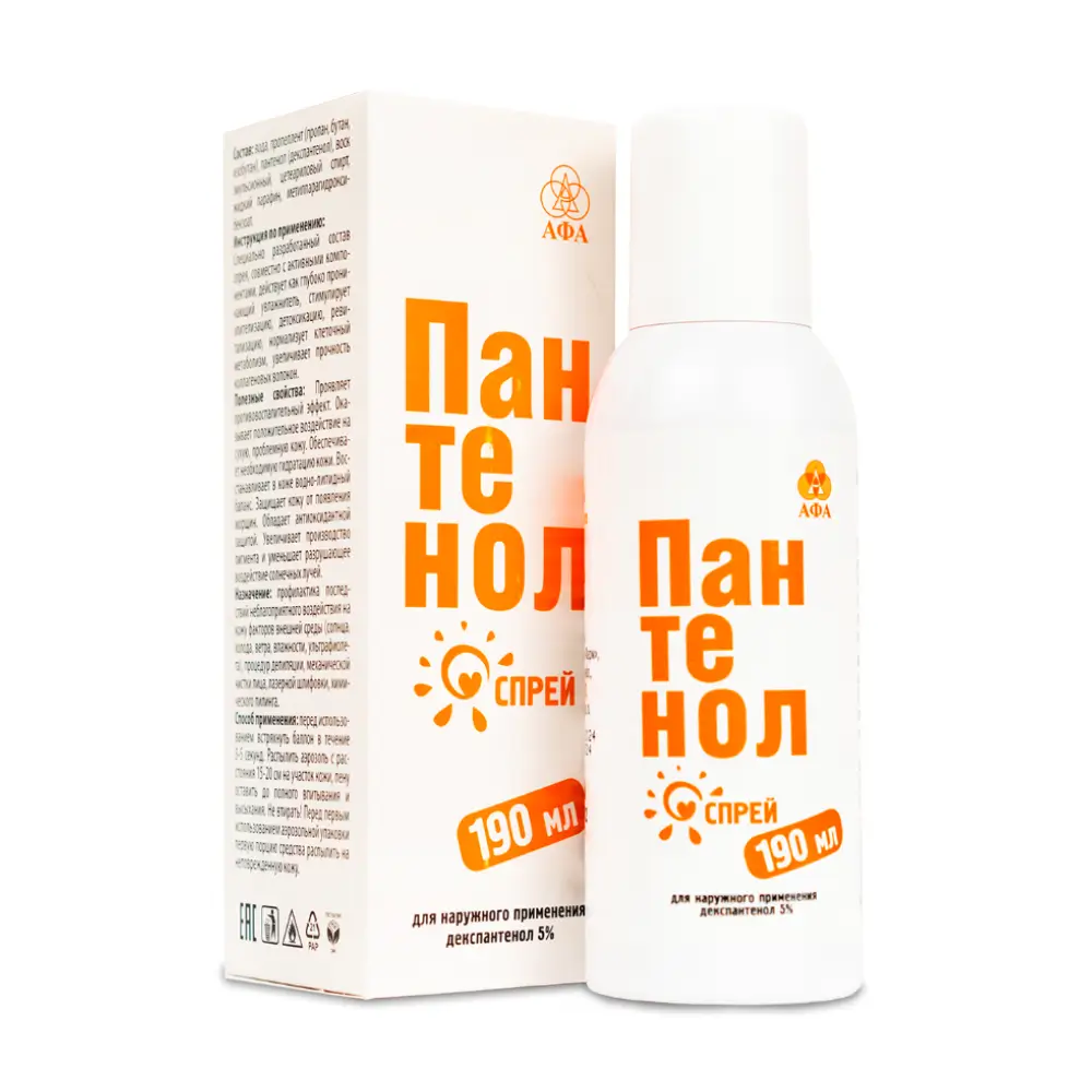 В составе спрея декспантенол — аналог пантотеновой кислоты, который быстро впитывается в кожу. Это самая стабильная форма кислоты в жидкой форме1. Д-пантенол хорошо растворяется в воде, спирте, но не в жирных средах.