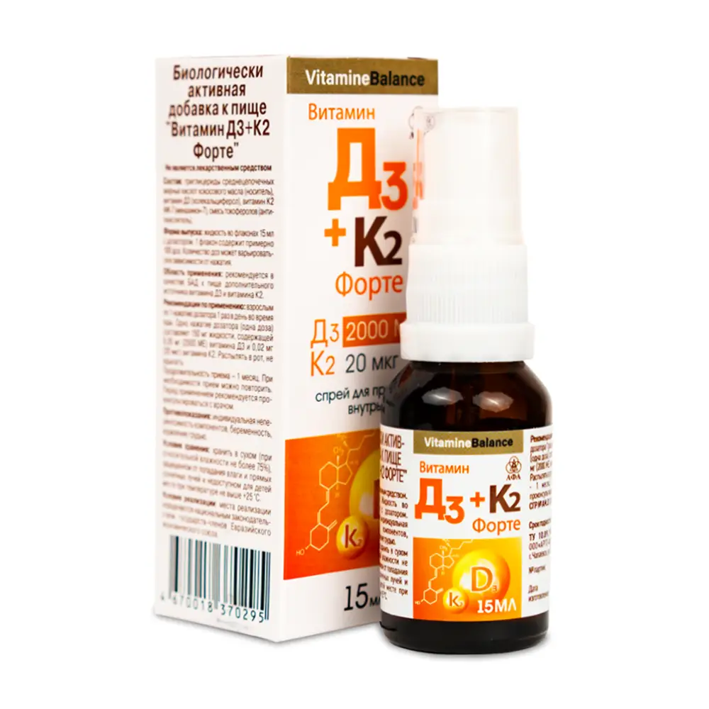 взрослым по 1 нажатию дозатора 1 раз в день во время еды. Одно нажатие дозатора (одна доза) составляет 150 мг жидкости, содержащей 0,05 мг (2000 МЕ) витамина Д3 и 0,02 мг (20 мкг) витамина К2. Распылять в рот, не вдыхать. Продолжительность приема – 1 месяц. При необходимости прием можно повторить. Перед применением рекомендуется проконсультироваться с